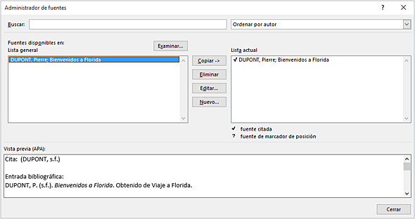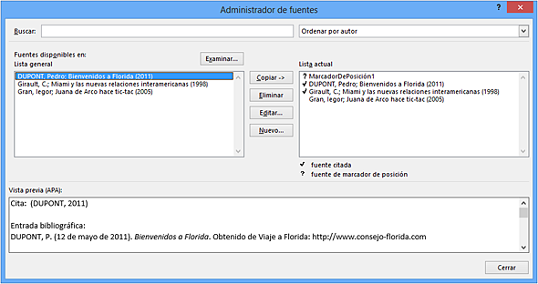 En el cuadro Lista actual, las fuentes citadas aparecen con una muesca y los marcadores de posición van precedidos por un signo de interrogación. Cuando una fuente no va precedida ni por una muesca ni por un signo de interrogación, significa que dicha fuente no se ha citado en el documento. Sin embargo, si la fuente forma parte del cuadro lista actual, se integrará en la bibliografía.